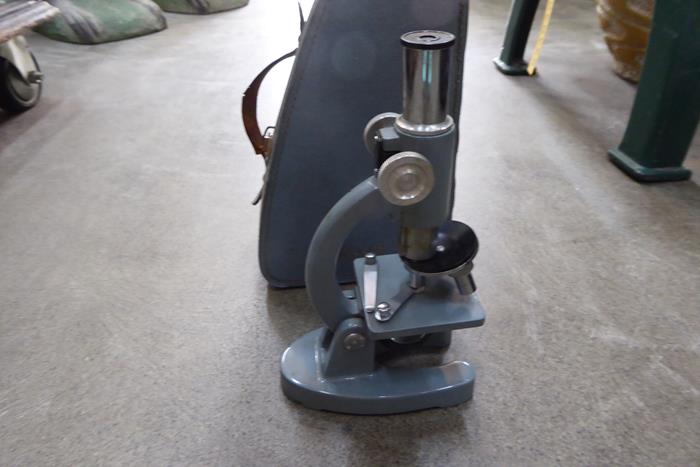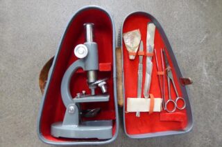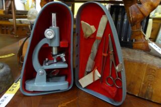 A COMPACT PORTABLE 1950S MICROSCOPE WITH ACCESSORIES, BY KENKO A Kenko, a Japanese optical product manufacturer, dissecting microscope set comes with a hard case with a distinct red velvet lining for protection and storage and various accessories.