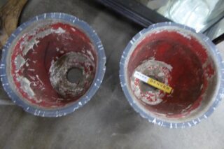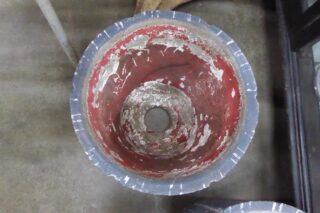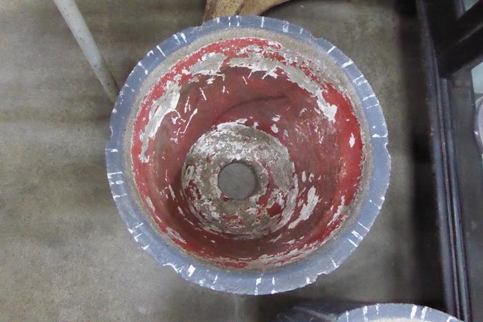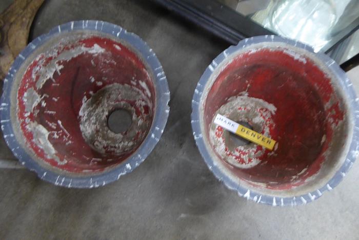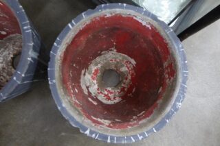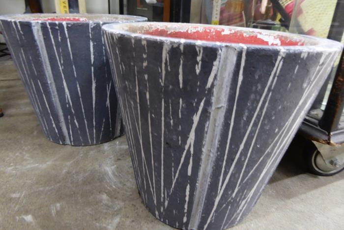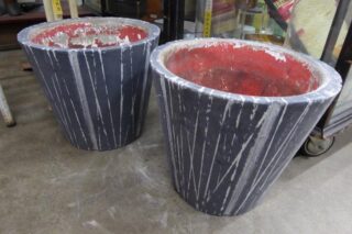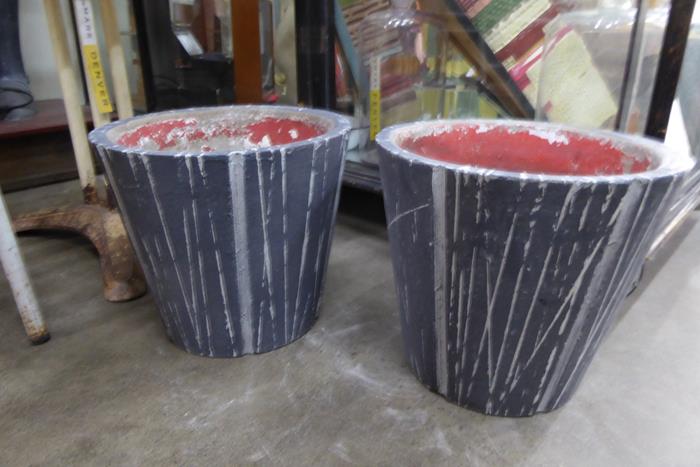 A PAIR OF MID CENTURY CONRETE PLANTER WITH STRIPPED PATTERN A pair of petite mid century concrete planters in dark charcoal with pale grey stripped patterns and red inside.