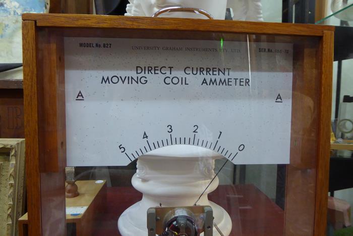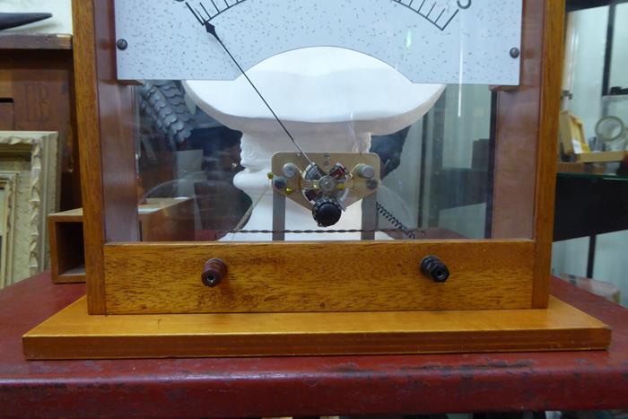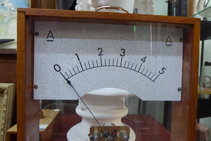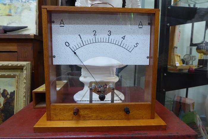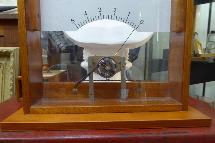 AN OVERSIZED DEMONSTRATION AMMETER ENCASED IN TIMBER Large scale ammeter encased in polished oak and perspex, made in Australia. A fully functional instrument once used in an educational setting and a visually appealing decor piece now.