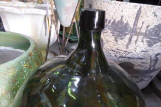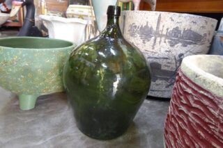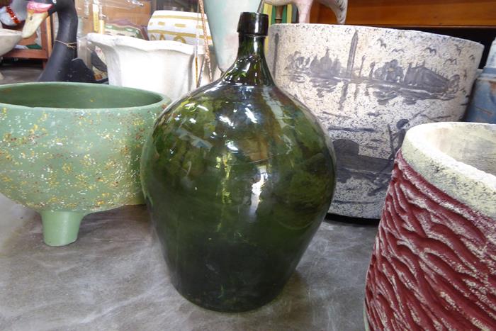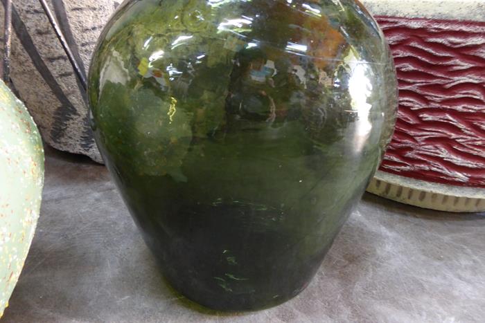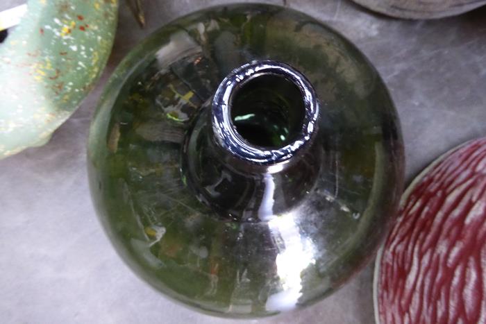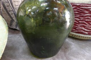 ANTIQUE FRENCH GLASS DEMIJOHN (NO 2) French glass bottle with a deep olive green hue from the 1800s. Perfect with beautiful imperfections, bubbles, asymmetry, indicating its hand blown nature, a beautiful piece.