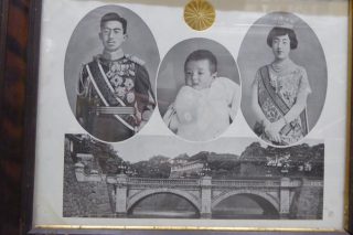 EMPEROR HIROHITO AND FAMILY A mid 1920s framed portrait of Emperor Hirohito, Empress Kojun and Princess Shigeko with the Imperial Palace.