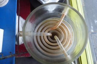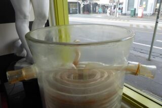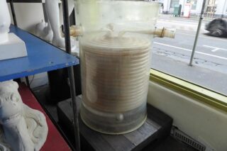 An amazing piece of gigantic industrial glassware by QVF, from an explosives factory with many metres of glass tubing coiled inside. We are using it as a pedestal for a piece of art work, but really an astounding art piece by is self.