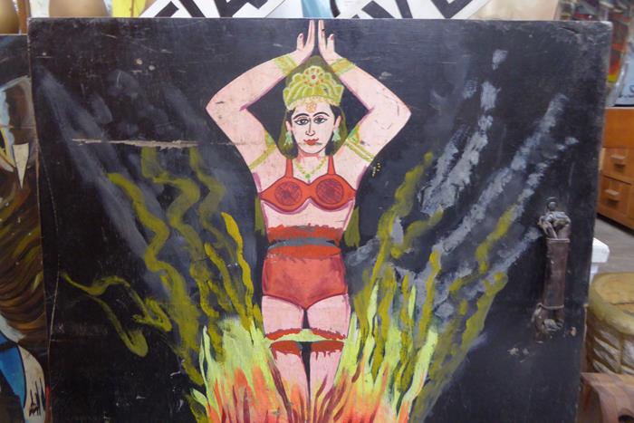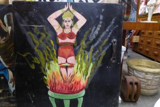 HAND PAINTED PANEL FROM A MAGICIAN’S TRUNK 1950S (NO 2) A panel from a magician’s trunk of tricks with a hand painted image of a fire dancer.