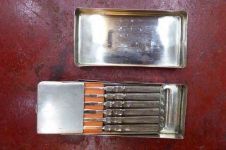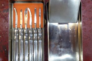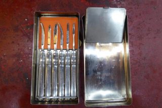 A 1920s scalpel set in a stainless steel case. Many other vintage medical instruments available.