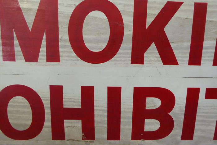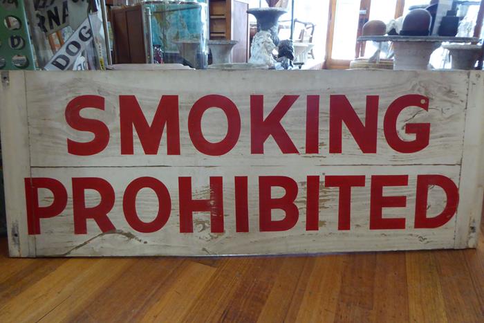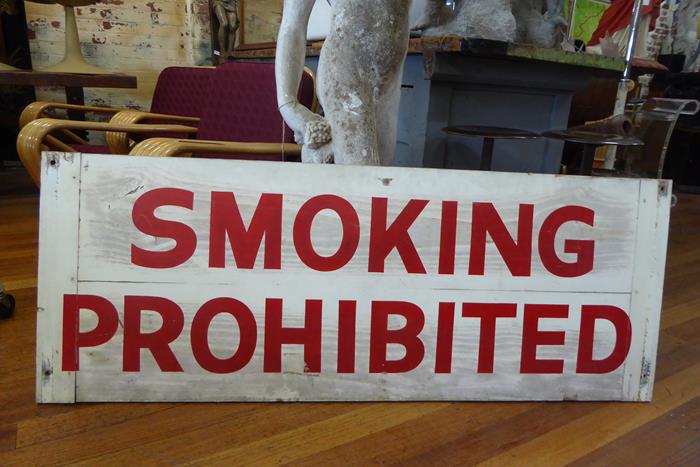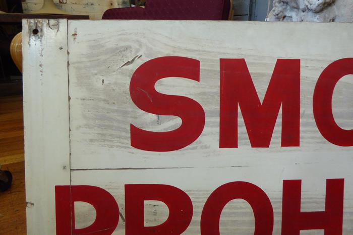 SMOKING PROHIBITED DOUBLE SIDED TIMBER SIGN A large hand-painted timber double sided industrial ‘No Smoking’ sign, c.1940.