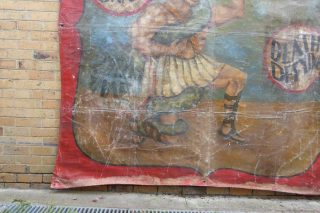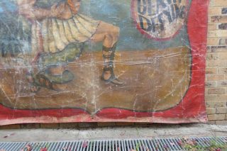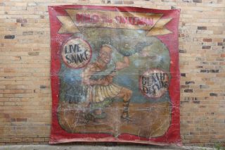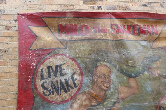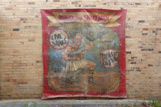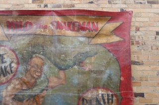 VINTAGE SIDESHOW BANNER – MILO THE SNAKE MAN A fabulous large 1930s hand painted sideshow banner on heavy canvas showing Milo the Snake Man wrestling a large green snake.