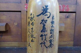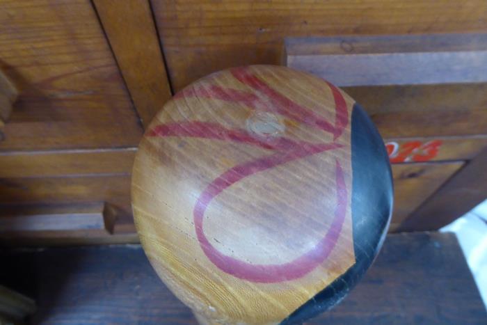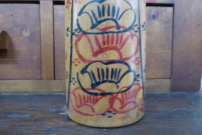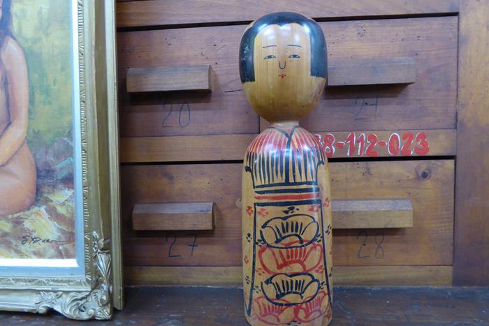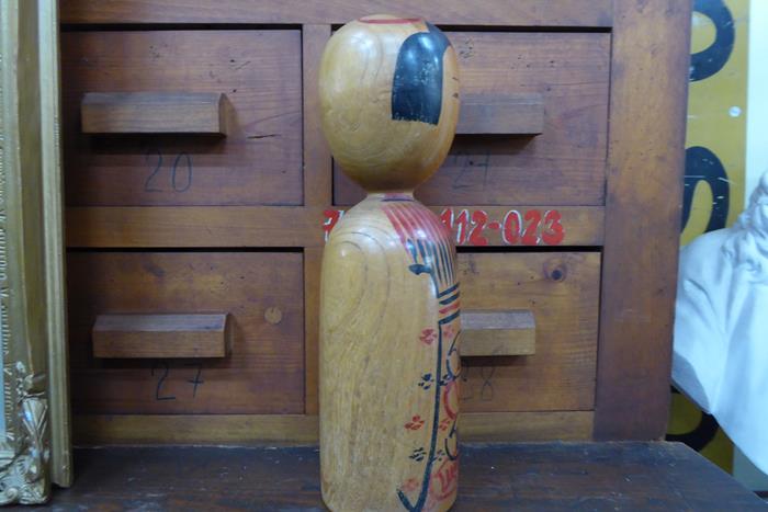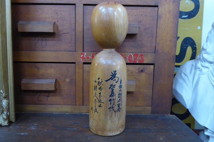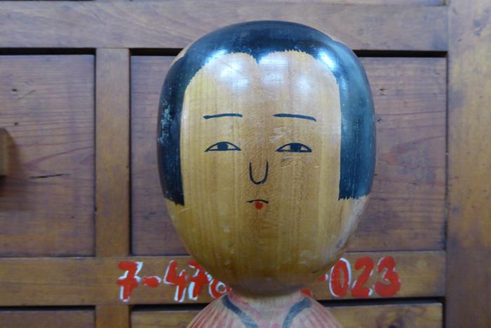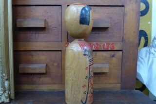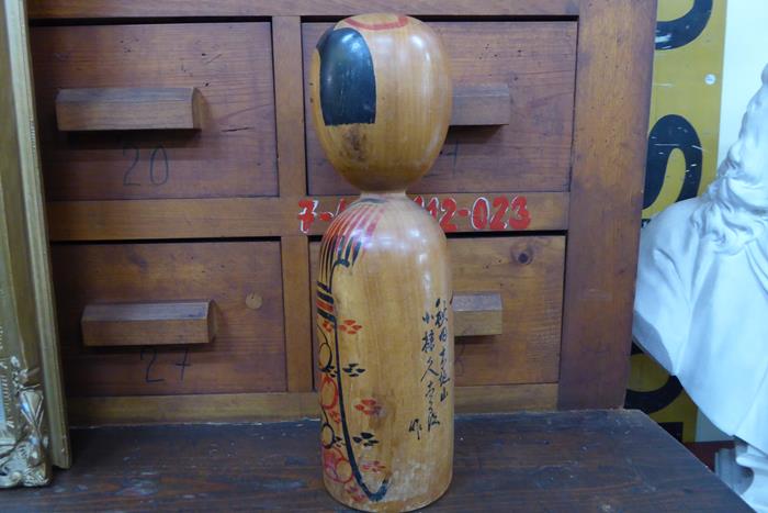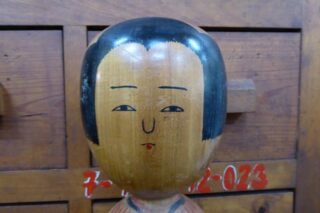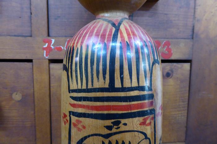 A vintage Kijiyama style Kokeshi doll, handcrafted by the renowned master artisan Kyutaro Ogura. The doll features a characteristic single piece body construction with a striped kimono and a stylized floral apron design. This is considered a rare and highly sought piece of Japanese folk art, dating from the 1960s. In excellent condition.